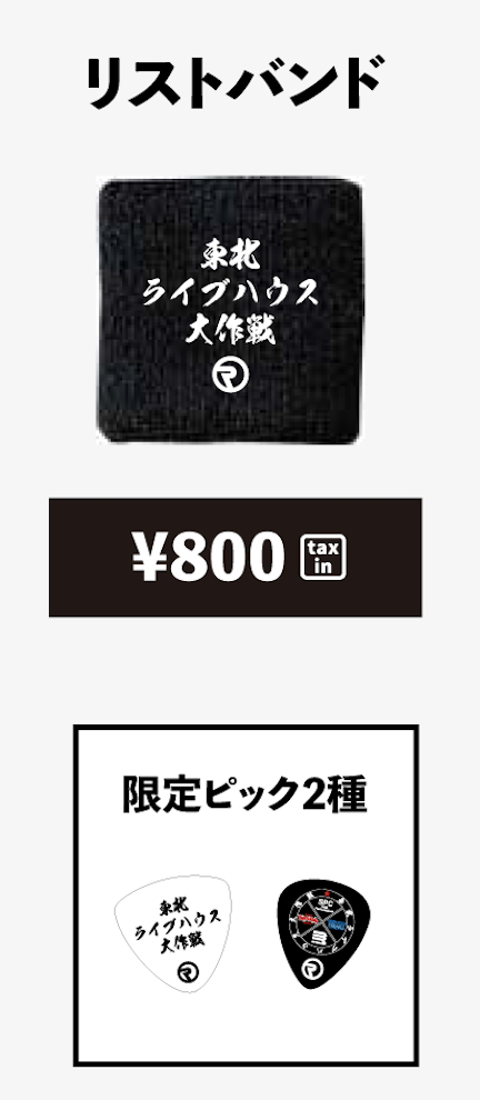 - 東北ライブハウス大作戦:リストバンド ¥800 *オリジナルピック先着特典配布
