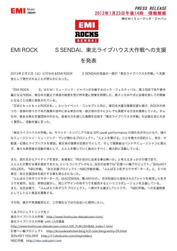 2月2日行われるEMI ROCKS SENDAIに東北ライブハウス大作戦ブースを設置させて